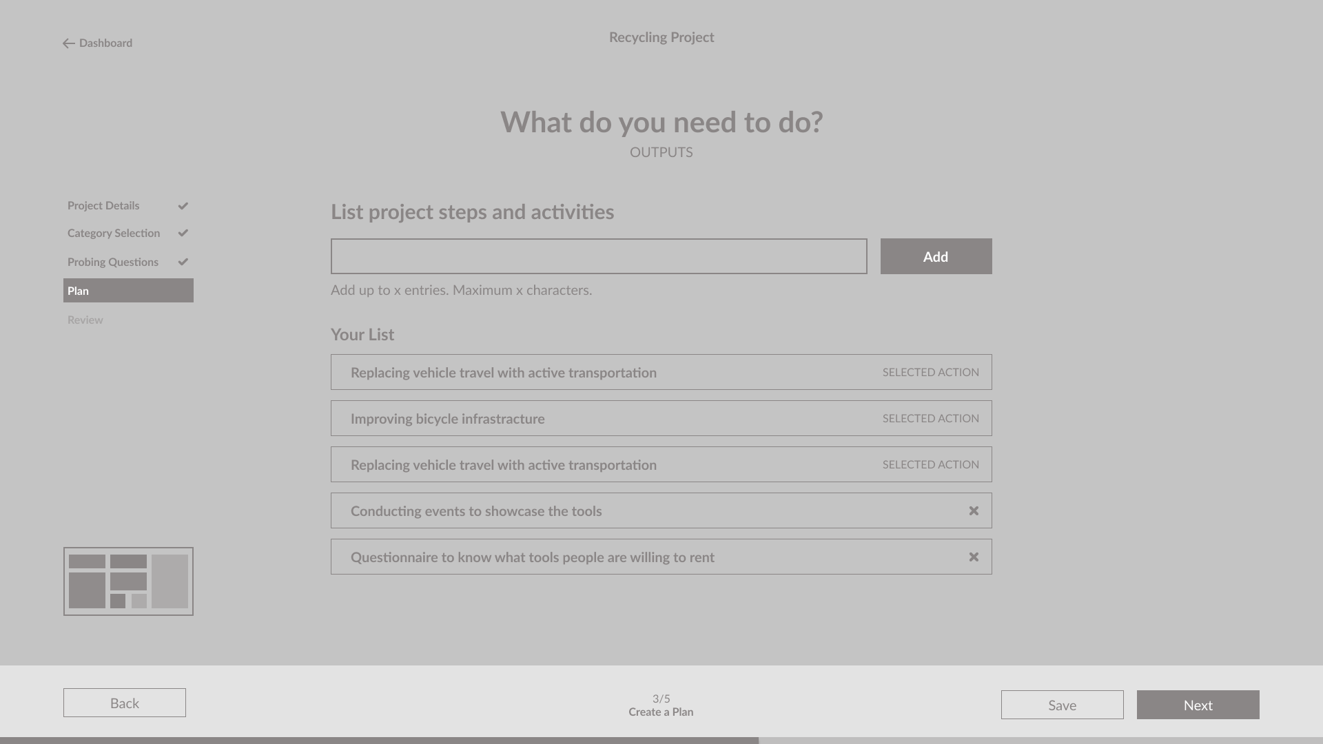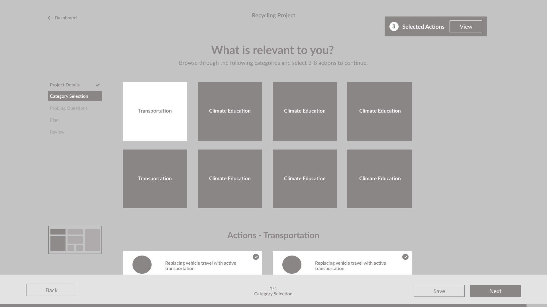 Allows the user to find an area of interest. Then, they are presented with a sub category selection; “Actions”, which is related to their selected initial category. These “Actions” are eco-friendly initiatives that comprises the final outputted project plan.